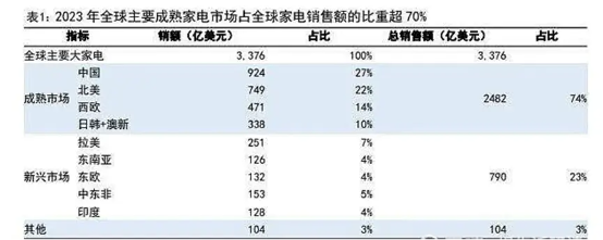 根據(jù)Euromonitor統(tǒng)計(jì)數(shù)據(jù),2023年主要大家電市場(chǎng)全球規(guī)模約3376億美元,其中中國(guó)、北美、西歐、日韓澳新等家電成熟市場(chǎng)合計(jì)規(guī)模2482億美元,占到全球主要大家電市場(chǎng)規(guī)模的74%,拉美、東南亞、東歐、中東非、印度新興市場(chǎng)合計(jì)規(guī)模790億美元,占到全球主要大家電市場(chǎng)規(guī)模的23%。