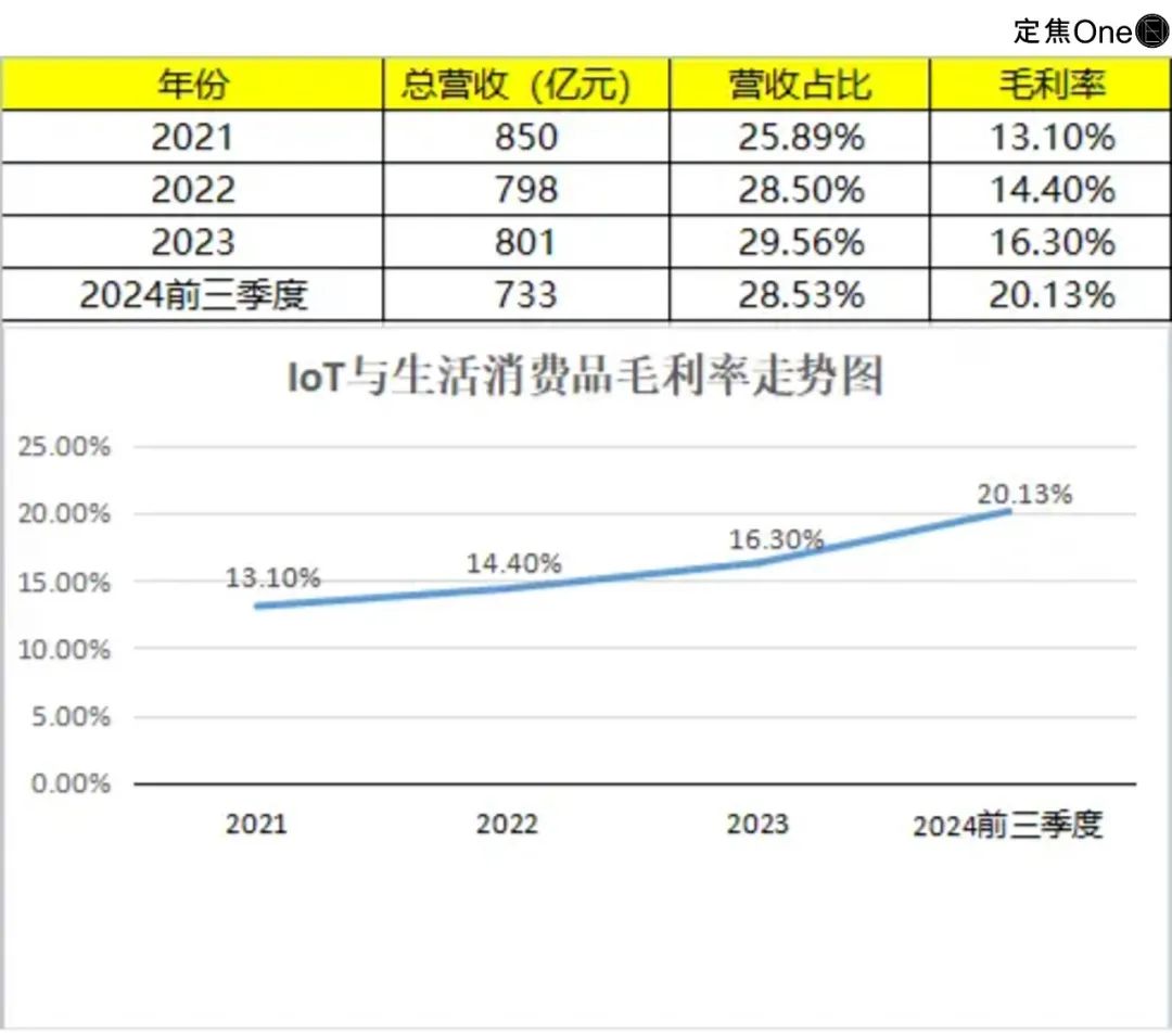 大家電業(yè)務(wù)一直被歸在IoT與生活消費(fèi)品中,從近幾年財(cái)報(bào)走勢(shì)來(lái)看,這部分營(yíng)收較為穩(wěn)定,營(yíng)收占比持續(xù)上升,預(yù)計(jì)今年有望突破30%;毛利率也逐年增長(zhǎng),由2021年的13.1%上升至2024年前三季度的平均毛利率20.13%。