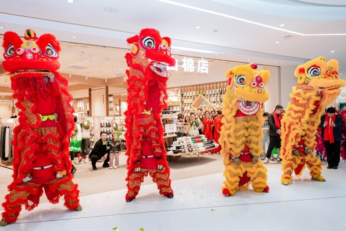 開(kāi)業(yè)儀式于11:08正式拉開(kāi)帷幕,松山棉店品牌創(chuàng)始人丁松山先生與合生匯商業(yè)負(fù)責(zé)人共同出席剪彩儀式,現(xiàn)場(chǎng)嘉賓齊聚,共同見(jiàn)證這一重要時(shí)刻。剪彩完成后,嘉賓們合影留念,記錄下這一具有里程碑意義的瞬間。隨后,福獅登場(chǎng),禮儀送上毛筆與朱砂,嘉賓點(diǎn)睛醒獅,舞獅采青、表演及互動(dòng)環(huán)節(jié)精彩紛呈。舞獅表演不僅為開(kāi)業(yè)慶典增添了熱鬧喜慶的氛圍,更寓意著松山棉店在北京市場(chǎng)的蓬勃發(fā)展。