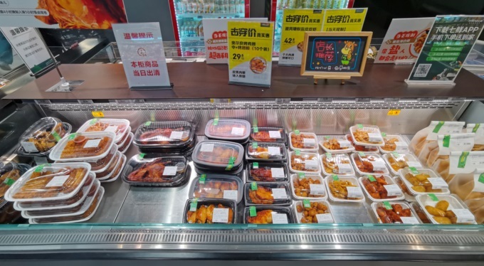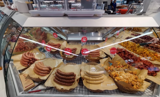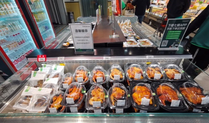 點(diǎn)評:京東七鮮在熟食品類的經(jīng)營主要是以單品經(jīng)營為主,沒有形成熟食商品品類矩陣,整體品類商品缺品缺項較嚴(yán)重,品類的豐富性嚴(yán)重不足,導(dǎo)致競爭力差。反之,盒馬鮮生的熟食品類在經(jīng)營上已經(jīng)形成清晰的烤、炸、鹵等商品矩陣,商品的出品品質(zhì)和豐富性較好,看了讓人極具購買欲。