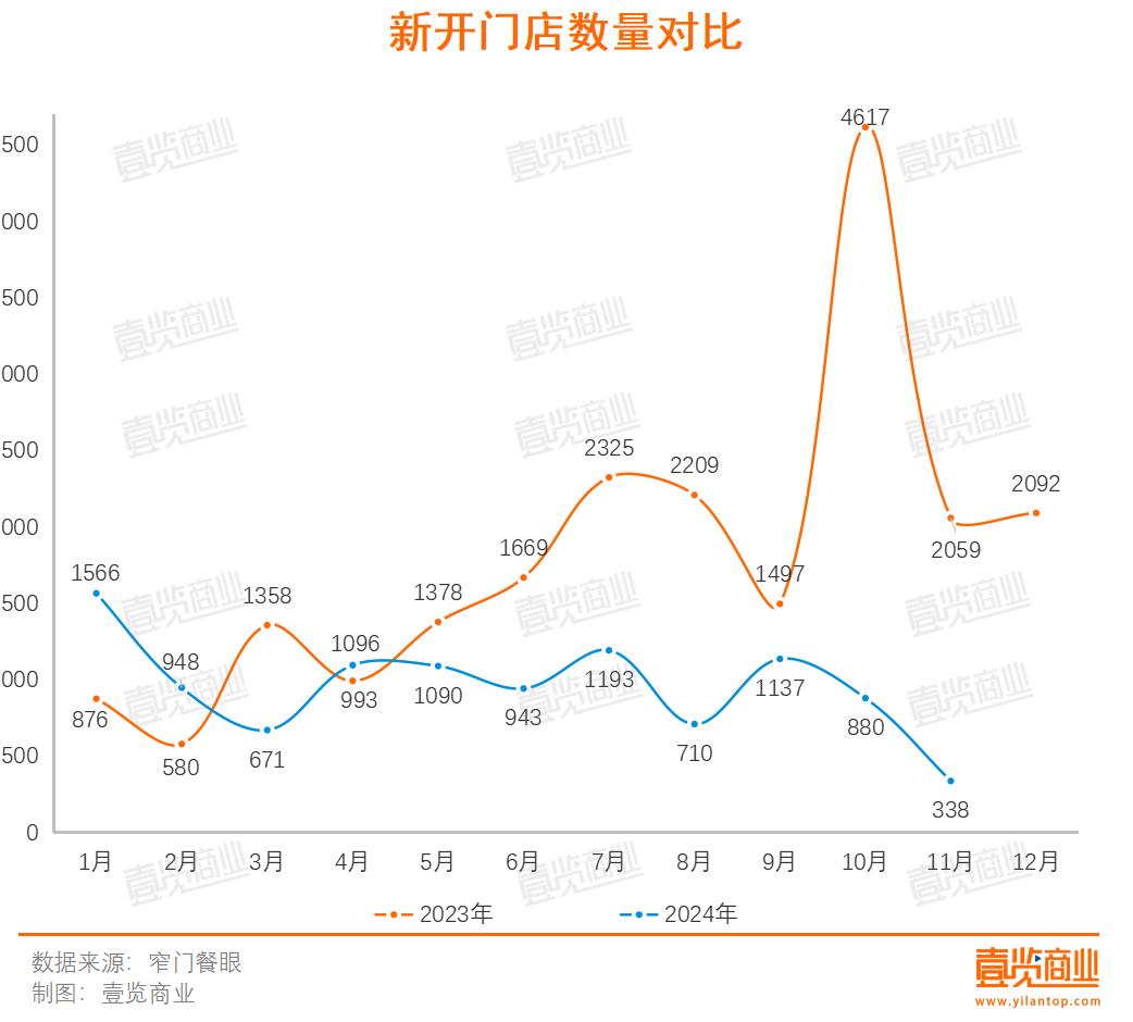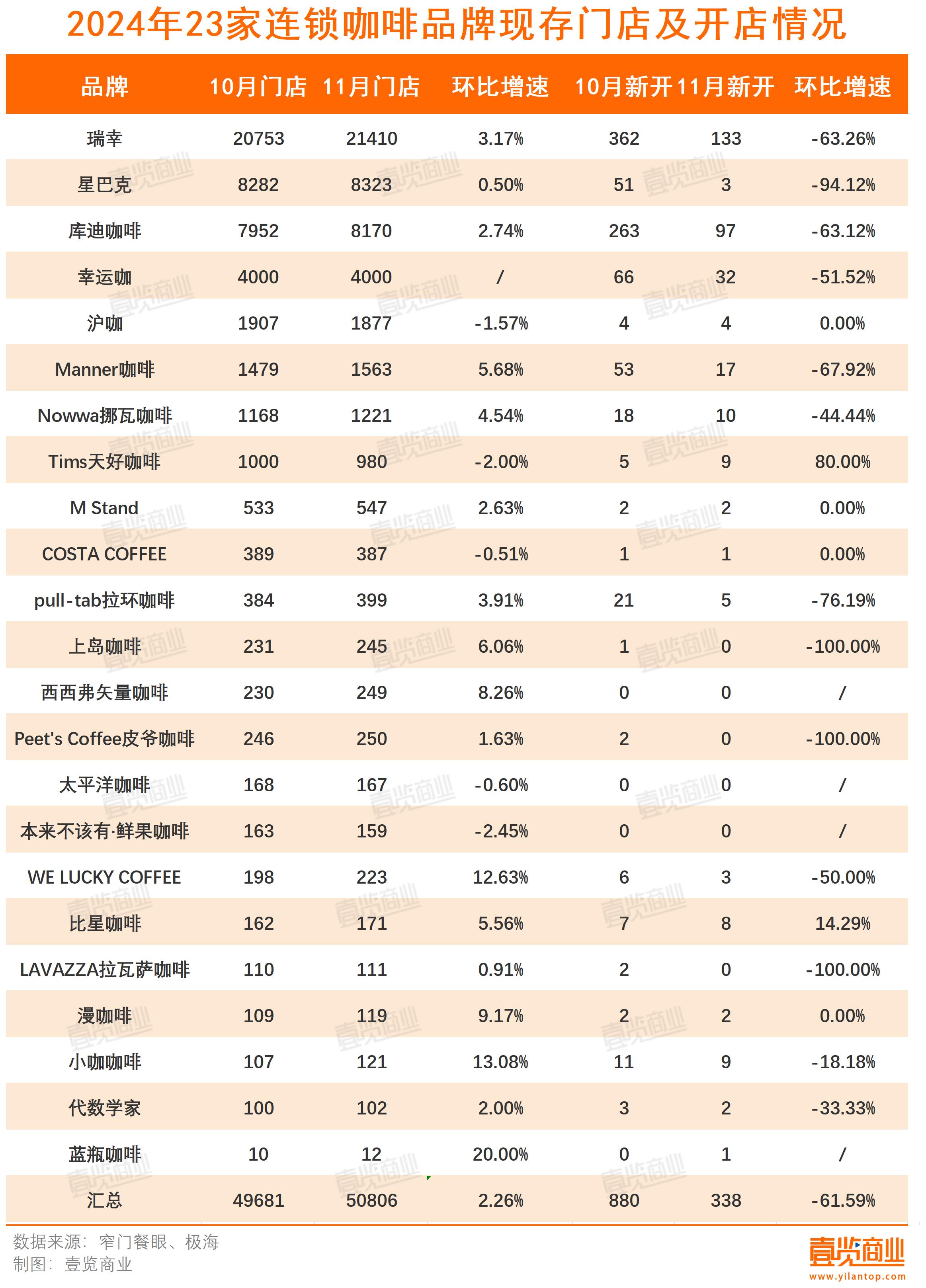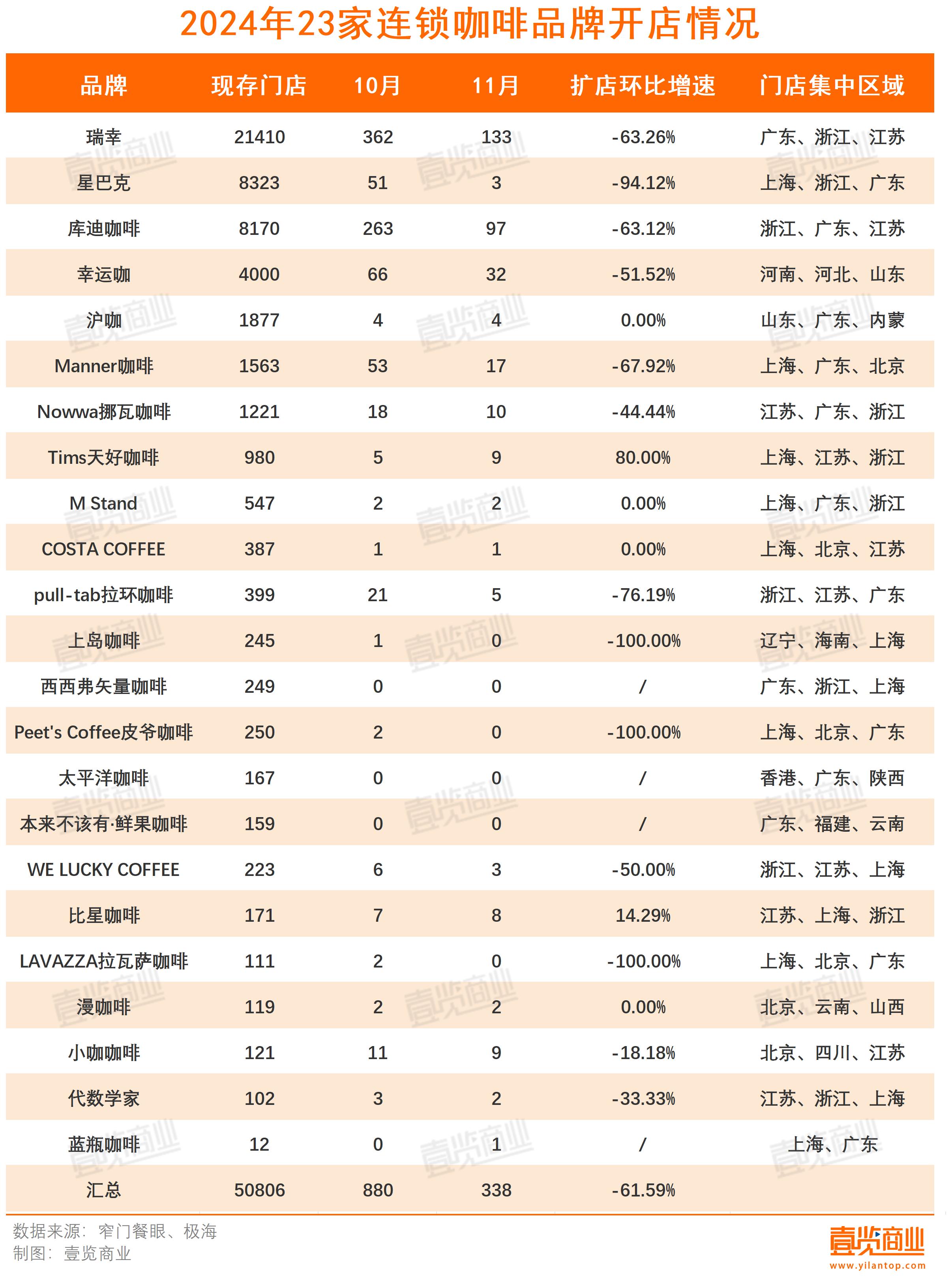 11月,壹覽商業(yè)長期跟蹤的23家連鎖咖啡品牌新開門店338家,環(huán)比下降超六成,同比2023年11月下降83.58%,門店總數(shù)達(dá)到50806家。