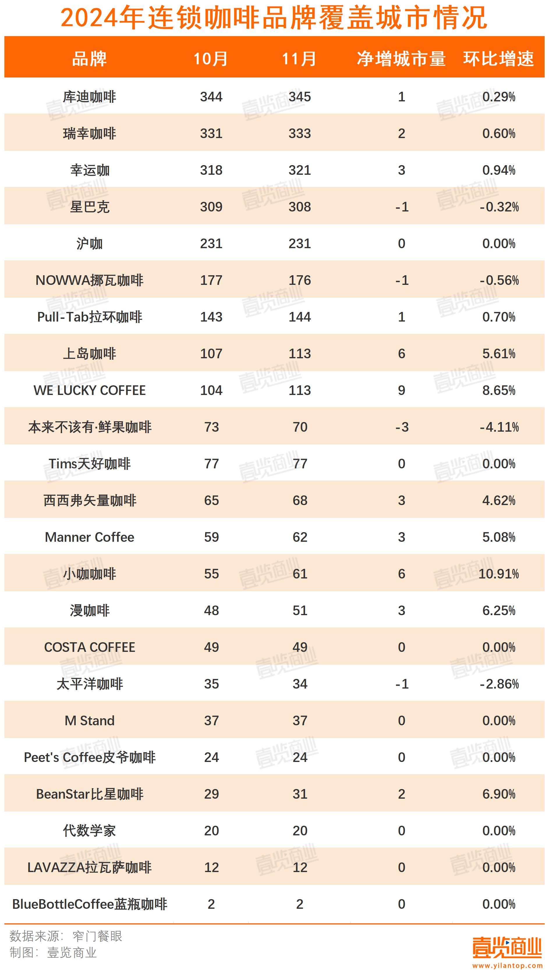 門店規(guī)模增速也顯著放慢,只有WE LUCKY COFFEE、小咖咖啡、藍(lán)瓶咖啡的門店存量增速超10%,滬咖、Tims天好咖啡、COSTA COFFEE、太平洋咖啡、本來不該有·鮮果咖啡的門店數(shù)量呈現(xiàn)下滑態(tài)勢,且滬咖、Tims天好咖啡、COSTA COFFEE在11月都開出新店,說明開店沒有閉店快。