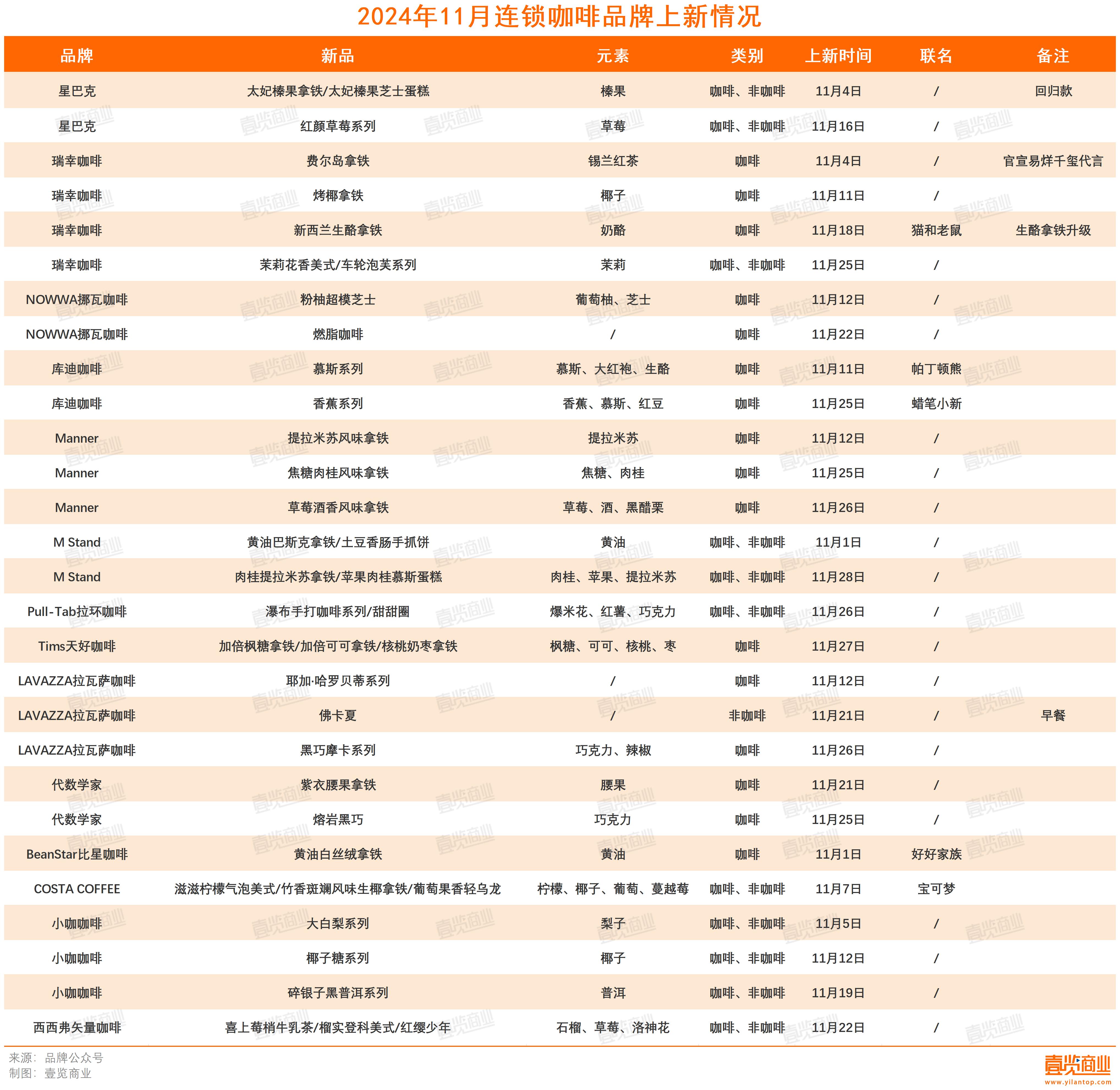 據(jù)壹覽商業(yè)不完全統(tǒng)計(jì),11月,23家連鎖咖啡品牌推出至少28個(gè)系列新品。比起9月旺季,上新次數(shù)減少8次。