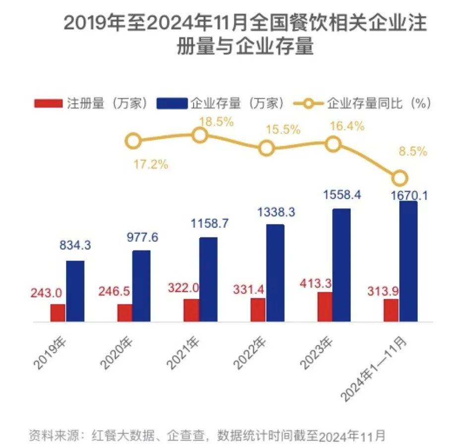 企查查數(shù)據(jù)顯示,近幾年,餐飲相關(guān)企業(yè)的注冊數(shù)量連年走高,企業(yè)存量亦逐年遞增。