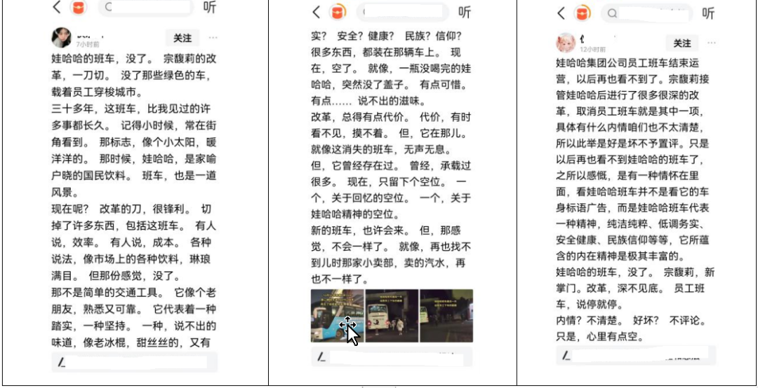 文章稱“以后再也看不到娃哈哈的班車了,之所以感慨,是有一種情懷在里面,看娃哈哈班車并不是看它的車身標(biāo)語廣告,而是娃哈哈班車代表一種精神,純潔純粹、低調(diào)務(wù)實、安全健康、民族信仰等等,它所蘊(yùn)含的內(nèi)在精神是極其豐富的!