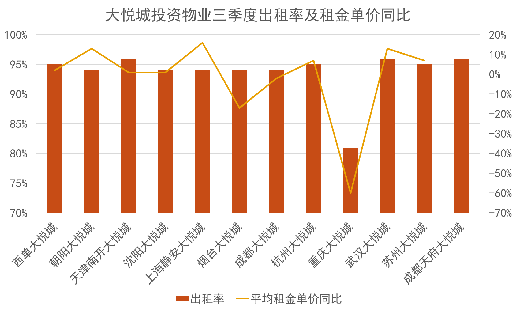 期內(nèi),樣本企業(yè)大悅城地產(chǎn)公告了三季度的項(xiàng)目運(yùn)營(yíng)情況,對(duì)出租率及平均租金單價(jià)變化等進(jìn)行披露。