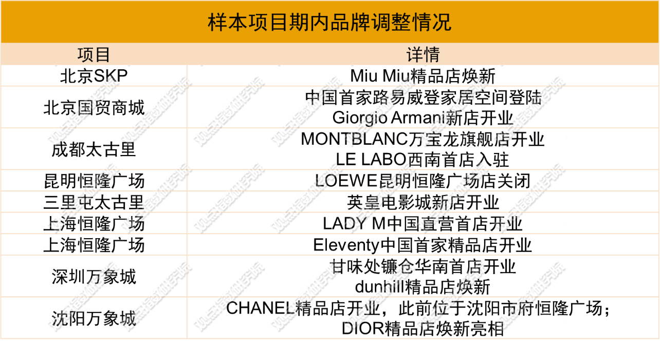 樣本項(xiàng)目層面,觀點(diǎn)指數(shù)長(zhǎng)期觀察的多個(gè)項(xiàng)目期內(nèi)均進(jìn)行了品牌調(diào)整,業(yè)態(tài)上以奢侈品、餐飲、影院品牌為主。