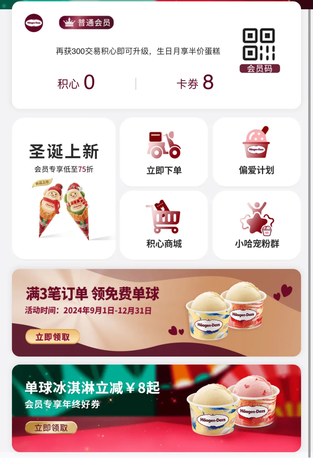 紅餐網(wǎng)注意到,目前注冊哈根達(dá)斯的免費(fèi)會(huì)員就送8折券,每年還能領(lǐng)取單球冰淇淋減8元券,雙球冰淇淋減20元券等。此外,今年以來,哈根達(dá)斯也不止一次推出59元2份、69元2份手裝單球冰淇淋的優(yōu)惠活動(dòng)。