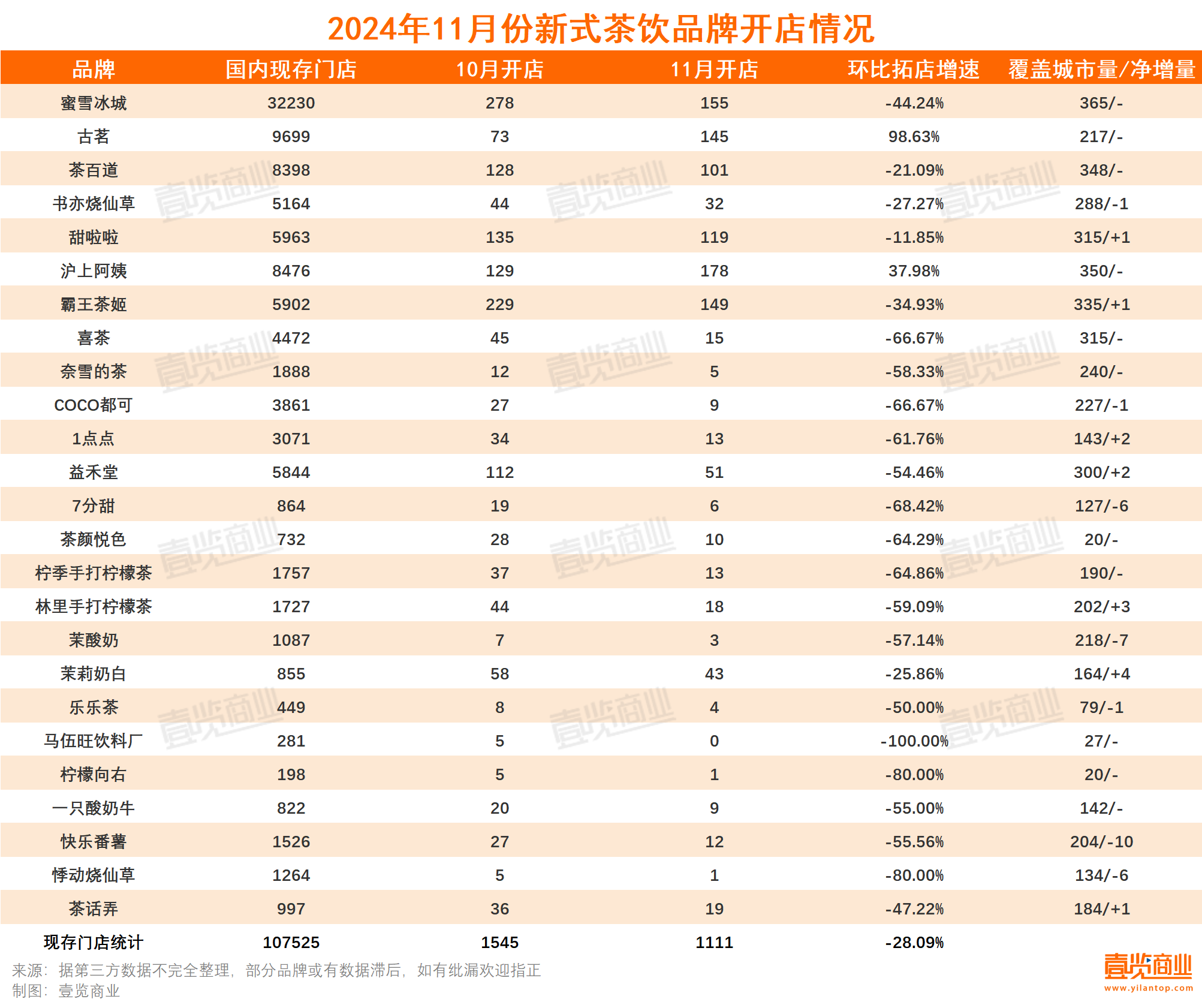 11月,壹覽商業(yè)長(zhǎng)期跟蹤的25家新茶飲連鎖品牌一共新開(kāi)門(mén)店1111家,數(shù)量與上月相比減少434家,新開(kāi)門(mén)店總量環(huán)比減少28.09%,較去年同比減少68.22%,現(xiàn)存門(mén)店一共107525。