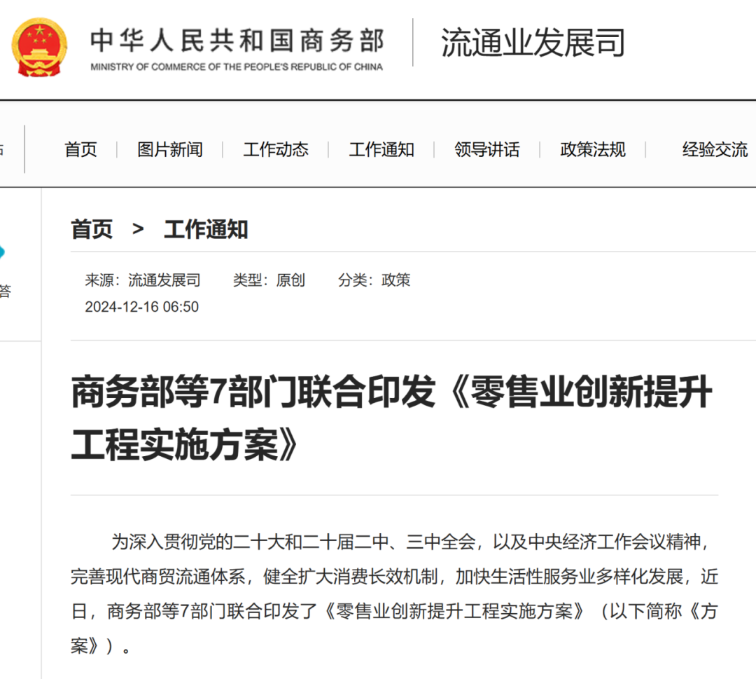 針對(duì)我國零售業(yè)市場(chǎng)規(guī)模大、經(jīng)營主體多,存在發(fā)展不平衡、優(yōu)質(zhì)供給不足、“內(nèi)卷式”競(jìng)爭(zhēng)等問題,日前,商務(wù)部等7部門聯(lián)合印發(fā)《零售業(yè)創(chuàng)新提升工程實(shí)施方案》(簡(jiǎn)稱“《方案》”)聚焦百貨店、購物中心、超市、社區(qū)商業(yè)中心等零售商業(yè)設(shè)施改造提升,提出培育現(xiàn)代零售體系的目標(biāo)。部署推動(dòng)場(chǎng)景化改造、推動(dòng)品質(zhì)化供給、推動(dòng)數(shù)字化賦能、推動(dòng)多元化創(chuàng)新、推動(dòng)供應(yīng)鏈提升共五個(gè)方面的工作任務(wù)。