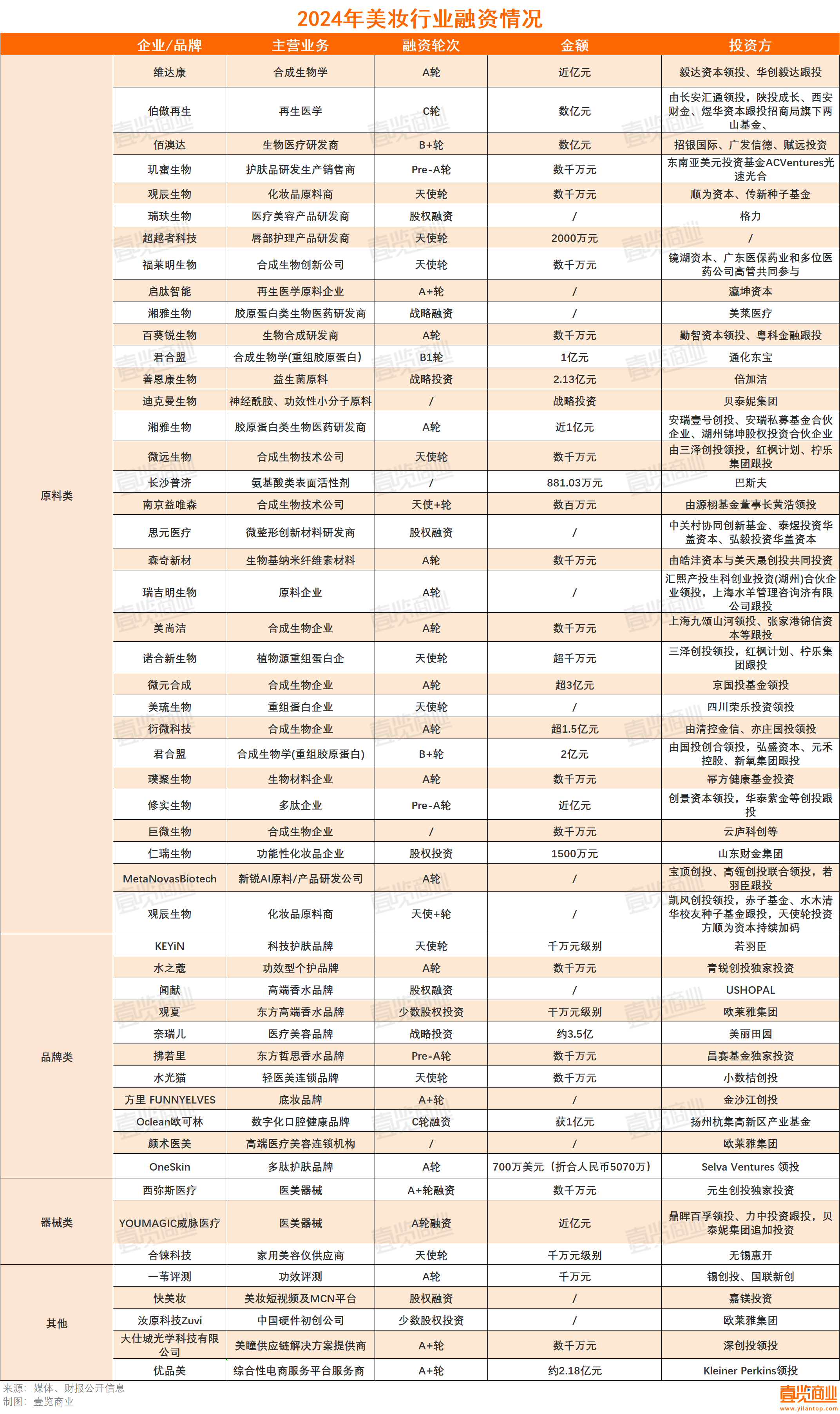 據(jù)壹覽商業(yè)不完全統(tǒng)計(jì),2024年美妝屆發(fā)生了52起融資,33起融資流向原料,11起流向品牌,3起流向器械。