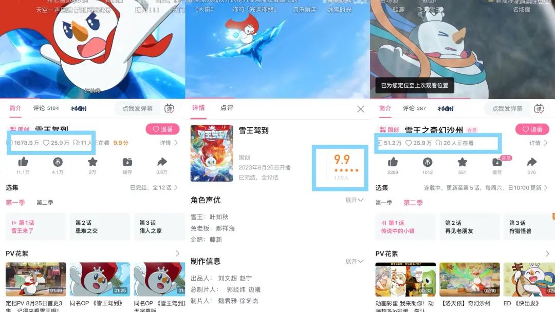 早在2023年8月,蜜雪冰城就推出首部動畫片《雪王駕到》,在B站播放量達到1678.9萬次,經1.1萬人評分后總評分達9.9分。今年12月21日,雪王第二部動畫《雪王之奇幻沙洲》上線,目前在B站已更新至第5話,播放量為51.2萬。