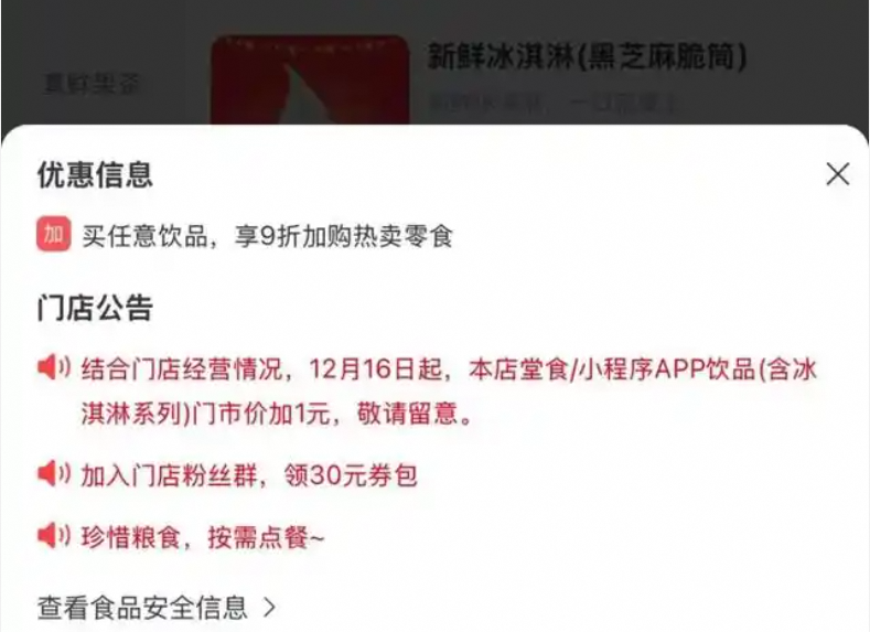 2023年9月,蜜雪冰城對部分飲品進行全國性的價格上調。包括蜜桃四季春由6元漲到了7元、雪頂咖啡和拿鐵由6元漲到了7元、美式咖啡由4元漲到了5元等。今年3月,蜜雪冰城官宣稱對上海部分區(qū)域漲價1元;近日,廣州、深圳、北京部分區(qū)域多家蜜雪冰城門店在小程序上發(fā)布公告稱,“綜合門店經營情況,12月16日起,本店堂食,小程序APP飲品(含冰淇淋系列)門市價加1元”。