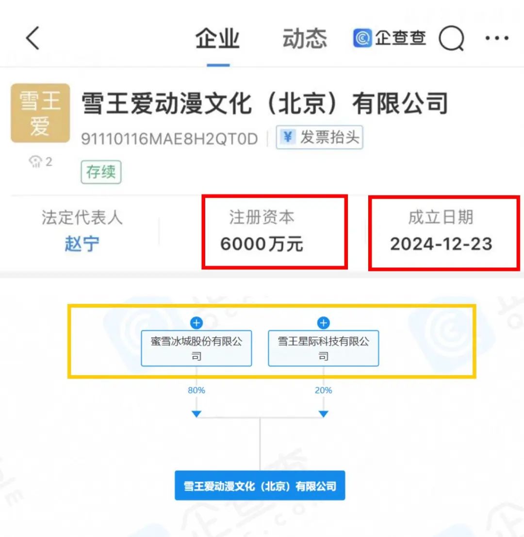 12月23日,雪王愛動漫文化(北京)有限公司(以下簡稱:雪王愛動漫公司)正式成立。據(jù)企查查數(shù)據(jù),雪王愛動漫公司法定代表人為趙寧,注冊資本6000萬人民幣,由蜜雪冰城股份有限公司及其子公司雪王星際科技有限公司共同持股。