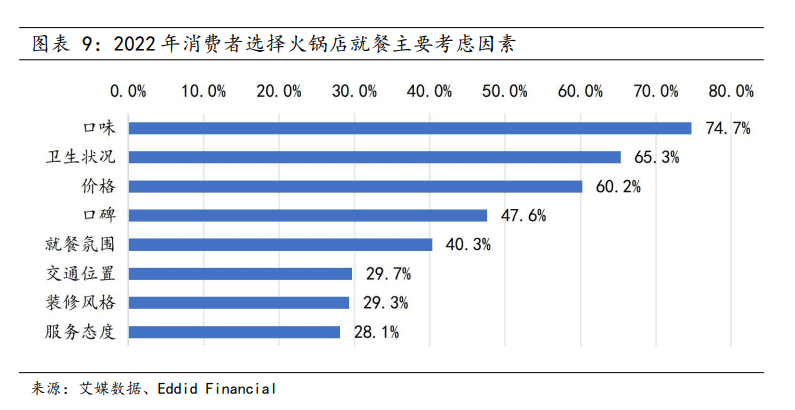 艾德證券期貨研報顯示,2022 年,消費者選擇火鍋店就餐主要考慮因素中,口味排名第一,占比高達74.7%。這正是主打極致口味的巴奴可以異軍突起的關鍵誘因。