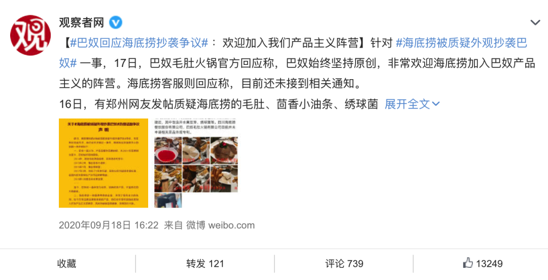 早在2020年9月,觀察者網就報道稱,海底撈的毛肚、茴香小油條、繡球菌等菜品及其擺盤方式與巴奴“撞車”。對此,巴奴發(fā)布聲明稱:“海底撈是一家值得尊敬的企業(yè),非常歡迎海底撈加入巴奴產品主義的陣營!