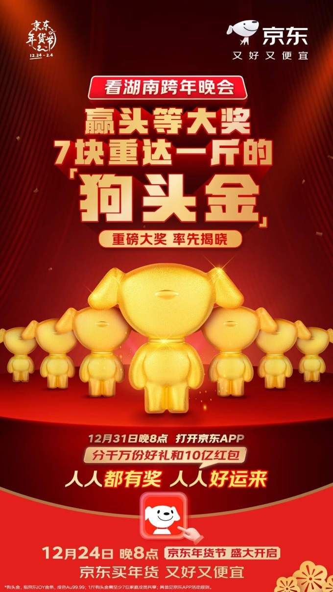 據(jù)了解,京東“狗頭金”采用了京東JOY形象,有5克、8克、10克、20克、50克、100克、200克、500克等不同規(guī)格,而此次湖南跨年晚會送出的“狗頭金”大獎則是500克(1斤)的規(guī)格。