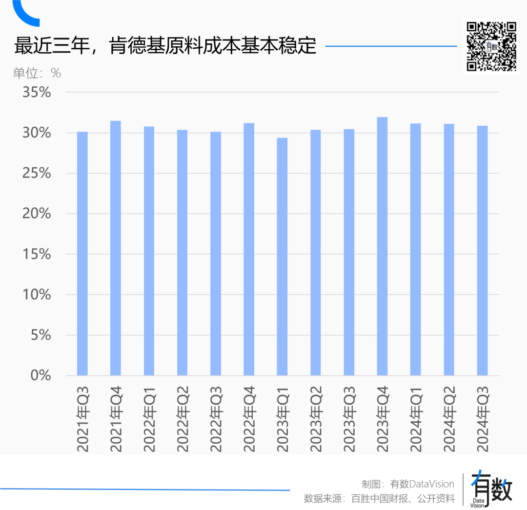 百勝的財(cái)報(bào)也反映了這一點(diǎn),肯德基的原材料成本始終保持相對(duì)穩(wěn)定,最近三年,其成本占收入比例基本都圍繞30%上下游走。