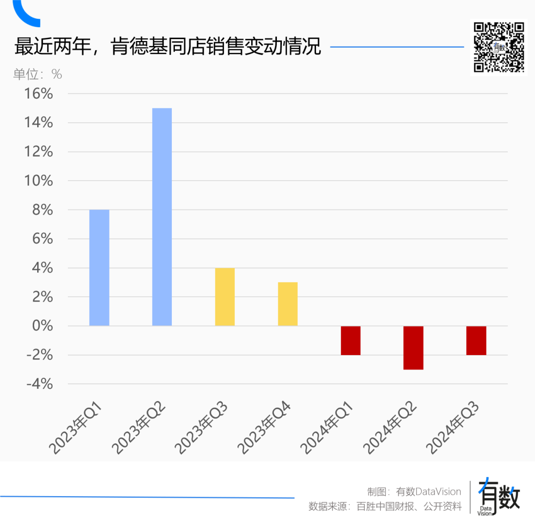 然而2022年的漲價(jià)帶來的療效并不持久,與漲價(jià)更接近的上半年,單店?duì)I收增幅可謂立竿見影,但下半年就明顯放緩。到了2024年,肯德基的門店經(jīng)營(yíng)狀況再度迎來負(fù)增長(zhǎng)。