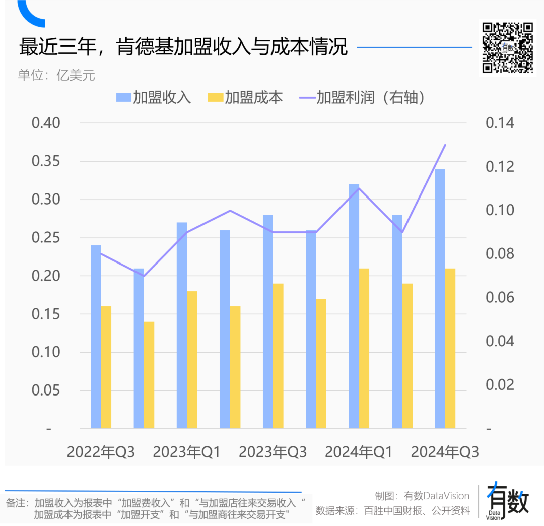 從現(xiàn)實(shí)層面來看,處于培育狀態(tài)的加盟體系對(duì)肯德基整體的拉動(dòng)作用還比較模糊,今年三個(gè)季度,肯德基加盟貢獻(xiàn)利潤(rùn)為0.33億美元,占整體經(jīng)營(yíng)利潤(rùn)比重還不足4%。