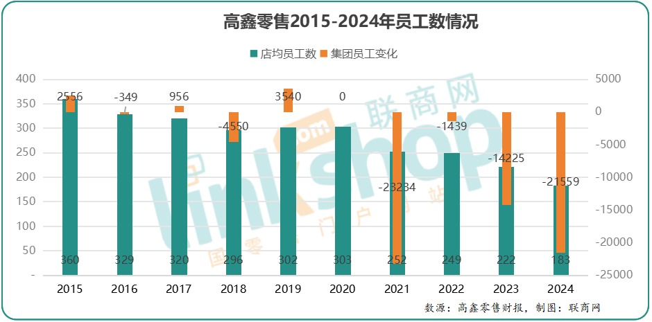 另一方面,隨著單店業(yè)績(jī)的下降,減員增效成了門店的必然選擇。按照年報(bào)披露,以大賣場(chǎng)業(yè)態(tài)核算,大潤(rùn)發(fā)單店員工數(shù)從2015年的360人/店,2024年降到183人/店,整個(gè)高鑫零售的集團(tuán)員工數(shù)也由14.77萬(wàn)人,下降到當(dāng)前的8.62萬(wàn)人,2024年相對(duì)2023年,整個(gè)集團(tuán)更是減少21559人;在去年3月份的一次出售傳聞中,有大潤(rùn)發(fā)員工透露,大潤(rùn)發(fā)內(nèi)部擬定門店精簡(jiǎn)硬指標(biāo),4月底是每店100人,管理團(tuán)隊(duì)是每店4名經(jīng)理,12名課長(zhǎng),多余主管降職降薪。