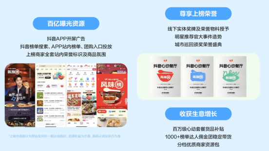 比如活動將整合同城、團購等核心引流入口,為商家?guī)戆賰|曝光;平臺還將提供上榜榮譽物料,包括線上的榮譽認證、線下實體獎牌和創(chuàng)意物料等;聯(lián)合超1000位達人,助力商家觸達消費者……整體來說,是根據(jù)抖音平臺的流量聚合、優(yōu)質(zhì)內(nèi)容生態(tài)等優(yōu)勢“定制”的資源和玩法。