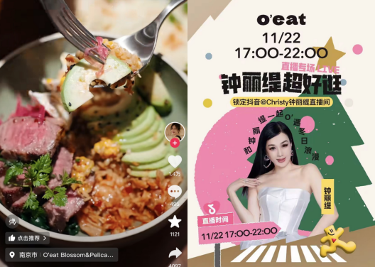 武漢西餐品牌O'eat,11月底就聯(lián)動抖音心動餐廳榜進行年度大場直播,還聯(lián)合楊子姍、鐘麗緹以及抖音頭部達人先后進行專場直播。一周時間,O'eat的直播GMV超過了1600萬。