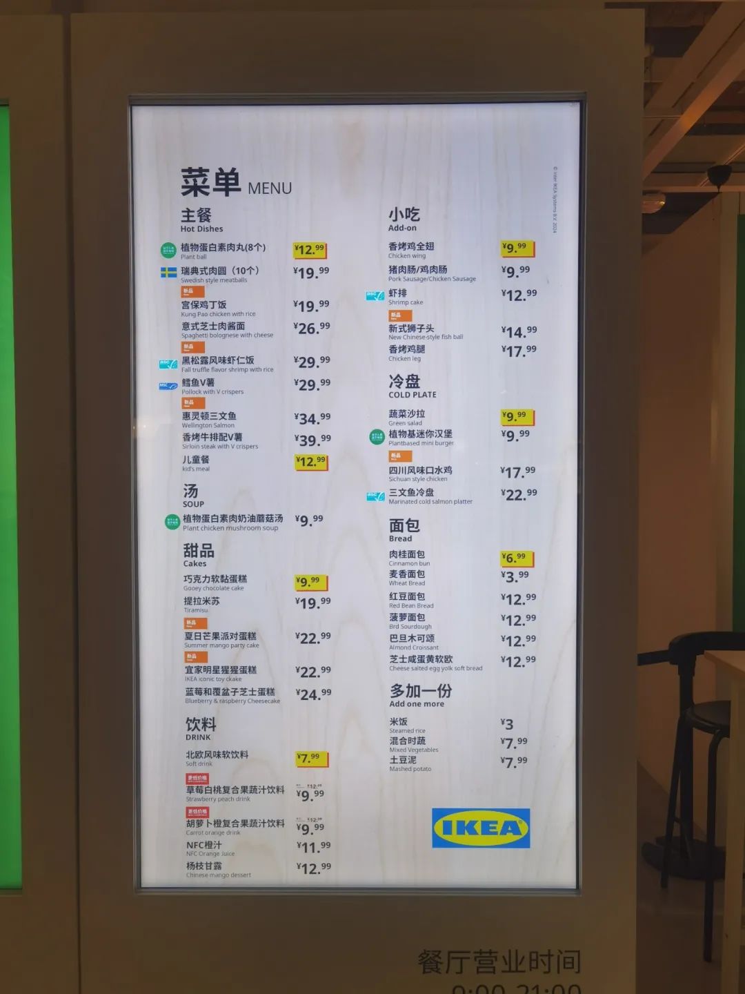 宜家產(chǎn)品的降價(jià)潮,還延伸到了宜家餐廳里。據(jù)首席編輯在餐廳菜單里看到,蔬菜沙拉,mini漢堡,烤雞翅,肉腸,奶油蘑菇湯均只要9.9元,還有一些面包,飲料,冰淇淋,烤肉串也都是個(gè)位數(shù)價(jià)格。