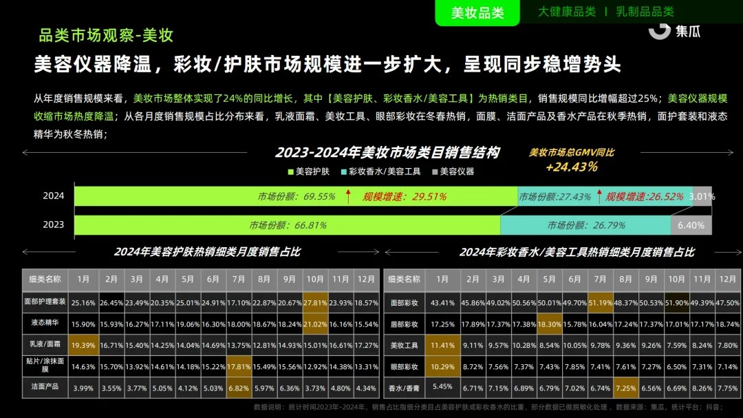集瓜數(shù)據(jù)顯示,大盤(pán)層面,2024年(截至12月11日),美妝市場(chǎng)整體實(shí)現(xiàn)了24%的同比增長(zhǎng)。其中,美容護(hù)膚市場(chǎng)份額69.55%,GMV同比增長(zhǎng)29.51%;彩妝/香水/美妝工具市場(chǎng)份額27.43%,GMV同比增長(zhǎng)26.52%;美容儀市場(chǎng)進(jìn)一步縮水,市場(chǎng)份額從6.4%縮減至3.01%。