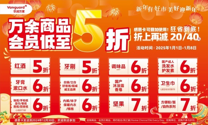 即日起至1月8日期間,華潤萬家萬余商品會員低至5折,日常囤貨類個人洗護、廚房清潔、調味品、方便食品及春節(jié)送禮紅酒、堅果等品類都在折扣范圍內;同時消費者領取的20元/40元感恩卡及68元減10元的微信支付優(yōu)惠券均可疊加使用,活動期間會員購買指定包裝休閑小食滿68元減30元,多買多減;會員購腌臘干貨滿150元立減50元,多買多減。
