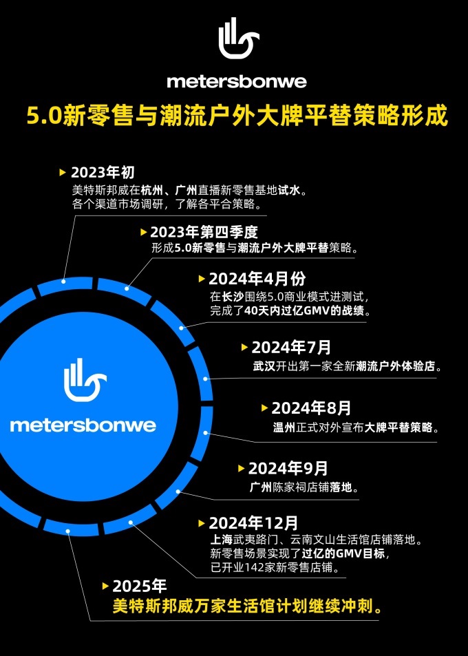 2023年,試水杭州、廣州直播新零售基地,通過(guò)線上線下深入調(diào)研,摸清平臺(tái)玩法;2023年第四季度,經(jīng)過(guò)反復(fù)論證后形成“5.0新零售”與潮流戶外“大牌平替”策略,以全域O2O模式建立品牌打法。