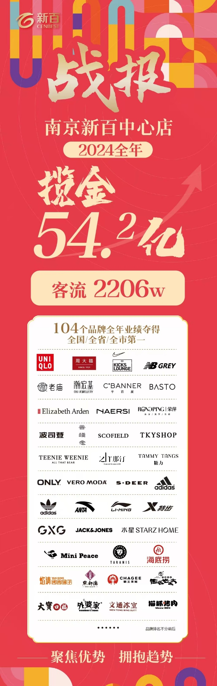 2024年,南京新百中心店“如期而變”,正大門幕墻和廣場煥新,打造高顏值城市會客廳;緊抓“首店經(jīng)濟”,引入多家江蘇首店和南京首店,以嶄新格局和氛圍帶給顧客全新體驗。全年圍繞“穩(wěn)存量,挖增量,提質(zhì)量”的工作思路,以顧客需求為導(dǎo)向,實現(xiàn)總銷售54.2億元,年客流量2206萬人次,104個品牌全年業(yè)績奪得全國或省、市第一,持續(xù)保持行業(yè)領(lǐng)跑態(tài)勢!