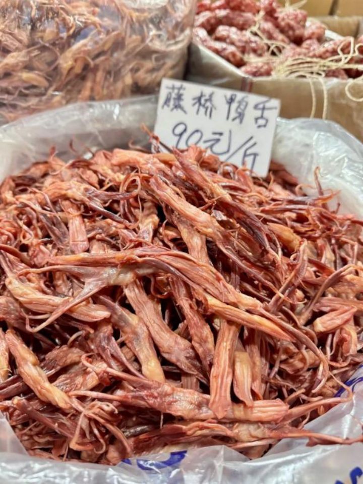 壹聚食品老板娘推薦藤橋鴨舌:“這個(gè)烤過的,更香,回頭客很多,我賣90,量大可以到85一斤。同品質(zhì)一般零售價(jià)每斤在110到120元。”
