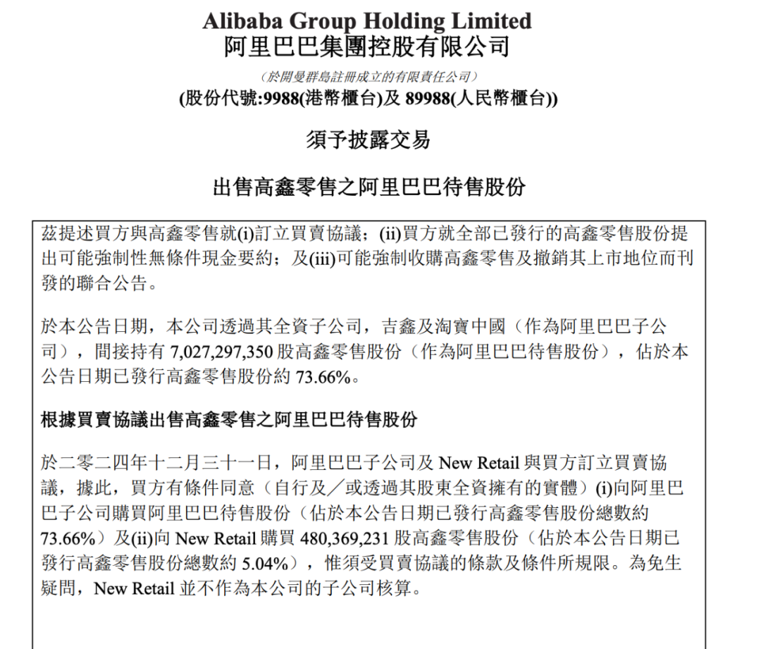 這是一場(chǎng)意料之中的出售。2024年9月,高鑫零售停牌,市場(chǎng)上關(guān)于阿里出售高鑫零售的傳言不斷。次月,高鑫零售發(fā)布公告稱有買家有收購意向。