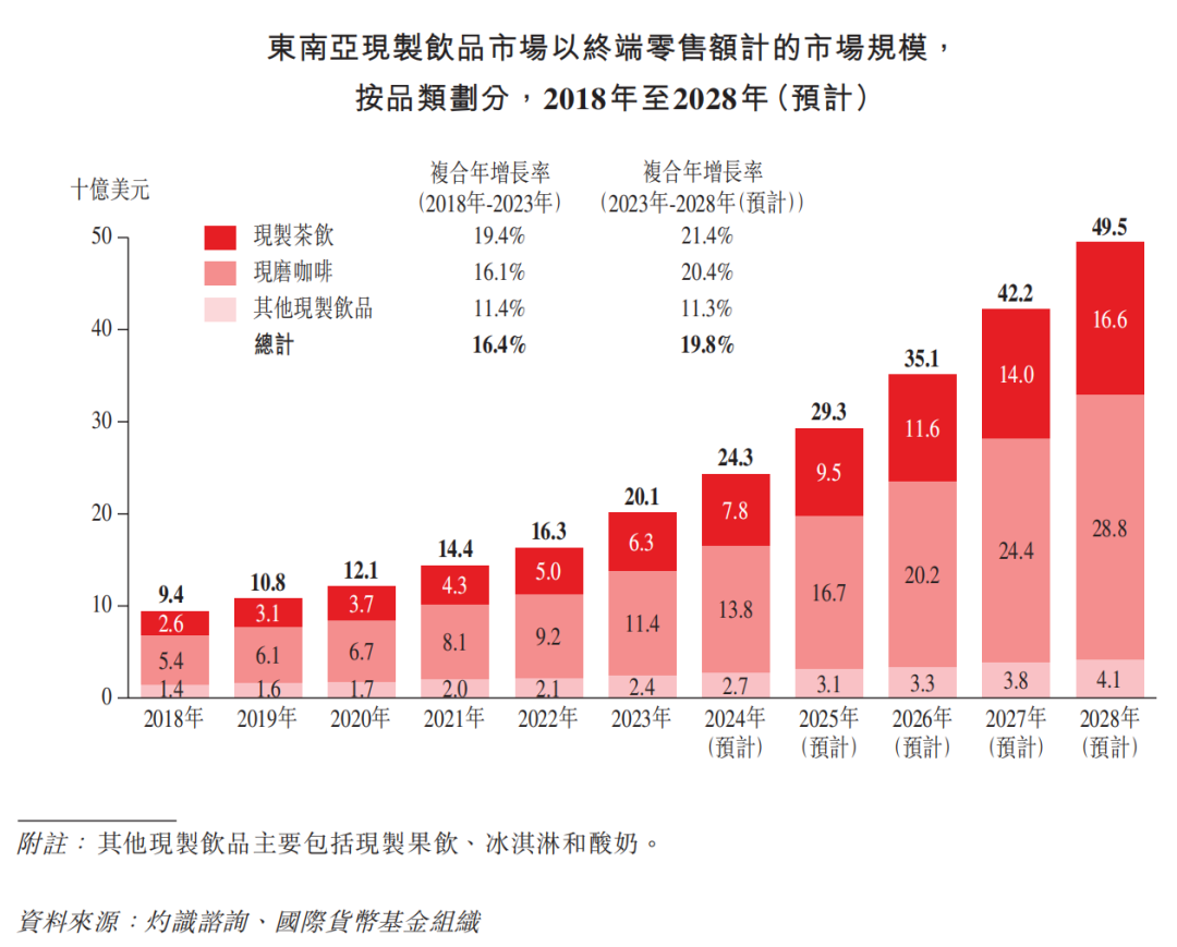 據(jù)機(jī)構(gòu)預(yù)測(cè),以終端零售額計(jì),東南亞現(xiàn)制飲品市場規(guī)模預(yù)計(jì)將以19.8%的復(fù)合年增長率,從2023年的201億美元增至2028年的495億美元,在全球主要市場中增速最快。與中國相比,當(dāng)?shù)噩F(xiàn)制飲品市場分散,連鎖化率低,還有較大的空間。