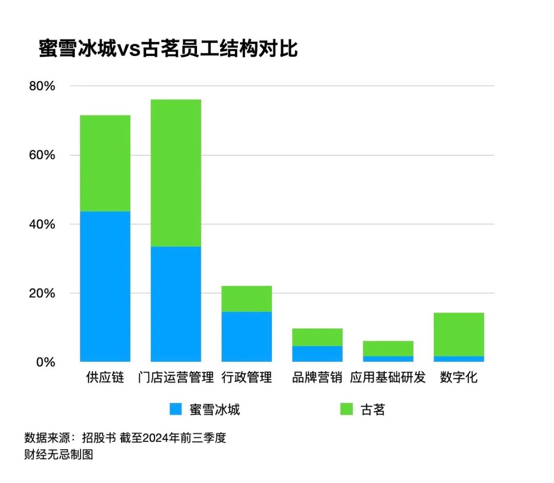 在蜜雪和古茗的員工結(jié)構(gòu)中,我們觀察到,占比最高的員工職能為供應(yīng)鏈、門店運營和管理,蜜雪和古茗該部分員均占比均超七成。