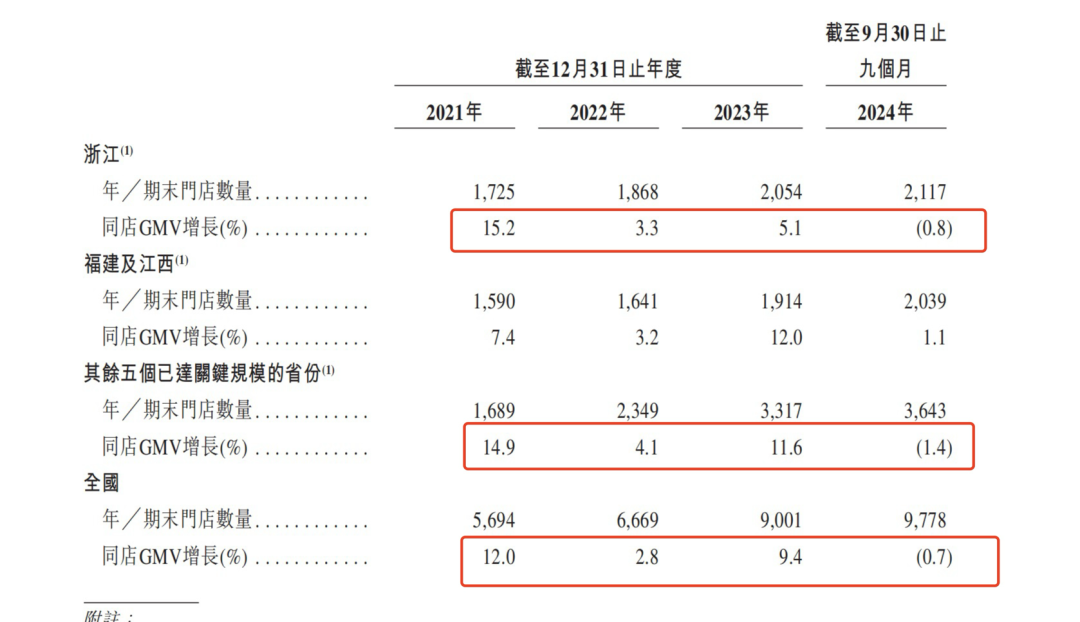 招股書顯示,今年前三季度,古茗的大本營浙江同店GMV首次出現(xiàn)下降情況,跌幅為0.8%,而其他已達關(guān)鍵規(guī)模的五省GMV增速也同比下降1.4%。