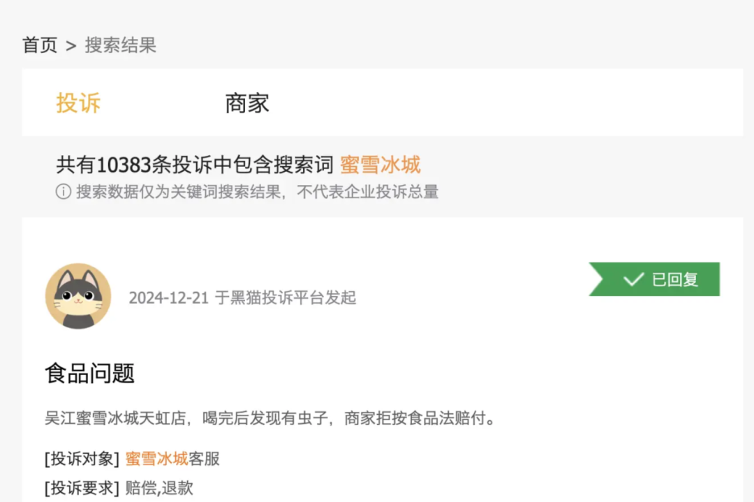 但對(duì)于蜜雪冰城來(lái)說(shuō),加盟商不足以承擔(dān)所有風(fēng)險(xiǎn),比如,用戶投訴和食品安全。在黑貓投訴上,關(guān)于蜜雪冰城的投訴量高達(dá)10383條。其中很大一部分消費(fèi)者都在投訴蜜雪冰城的食品安全問(wèn)題。比如,有消費(fèi)者表示在飲品中發(fā)現(xiàn)蟲子,有消費(fèi)者投訴喝了飲品身體不適。