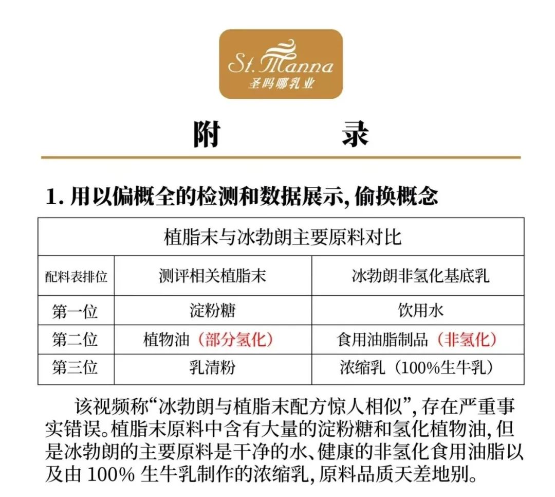 從成分上看,冰勃朗≠植脂末。冰勃朗配料的前三位是:飲用水、食用油脂制品(非氫化)、濃縮乳(生牛乳);植脂末配料的前三位是:淀粉糖、植物油(部分氫化)、乳清粉;冰勃朗和植脂末在使用原料、含量高低上有明顯差別,完全不是同一樣產(chǎn)品。