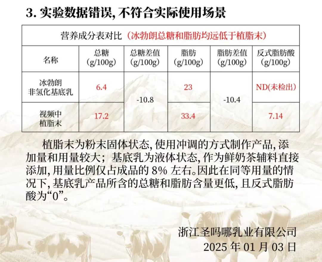 除了兩種原料的本質(zhì)區(qū)別外,還存在實(shí)驗(yàn)數(shù)據(jù)和使用場景帶來的差異性。通過實(shí)驗(yàn)測評,視頻中稱脫水以后“冰勃朗”的總糖和脂肪含量分別是10.2,45.4;植脂末是17.2和33.4,冰勃朗的脂肪含量比植脂末高。