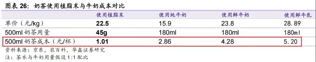 忽略掉茶底和糖等共有的相同成本。按照這個比例制作一杯500ml的奶茶,需要40ml冰勃朗,約1.5元(30元/1L);95ml牛乳,約2.75元(29/1L),總成本約4.25元。如果全部采用牛奶或者牛乳,根據(jù)華鑫證券的測算成本在4.28-5.20元之間。