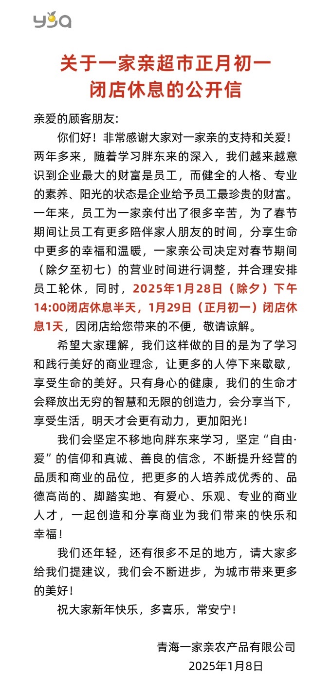 青海一家親超市宣布春節(jié)放假一天半