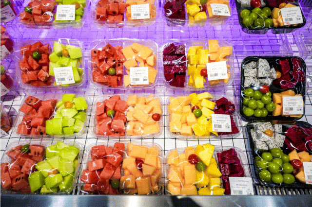 入口處的果切區(qū)一樣令人矚目。門店精選各種新鮮水果當(dāng)日制作,各種拼盤依照甜度的不同,貼心地標(biāo)明了食用順序;價格更是全面“祛魅”,如蜜瓜果切雙拼,門店定價14.9元,價格線較同行低2元,還有多種9.9元款;同時,基于鮮度,4小時8折,6小時6折。