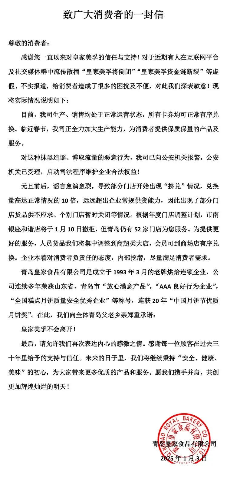 此外,1月3日,青島皇家食品有限公司總經(jīng)理姜耀東在大眾網(wǎng)的采訪中表示,“希望大家不要著急,有序排隊(duì),所有卡券均可正常有序兌換。請(qǐng)給皇家美孚一些時(shí)間,我們還是希望能保質(zhì)保量地給市民提供我們的放心產(chǎn)品!