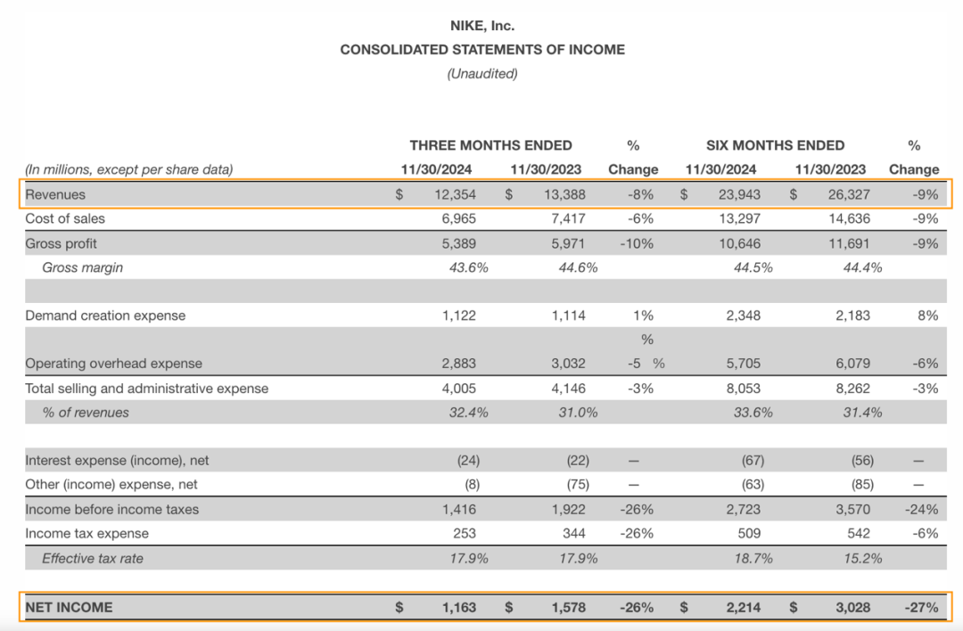 近日,耐克(NYSE:NKE)發(fā)布了2025財年第二季度的財報(截至2024年11月30日),數(shù)據(jù)顯示,2025財年上半年,耐克營收達(dá)239.43億美元,同比下滑9%,凈利潤為22.14億美元,同比下滑27%。