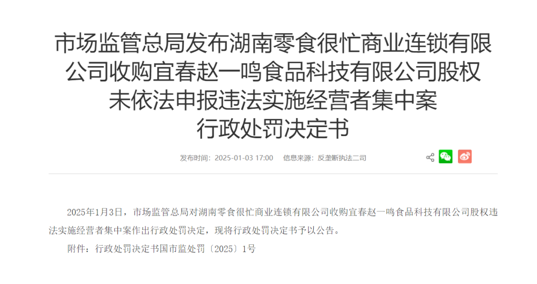 1月3日,市場監(jiān)管總局發(fā)布信息稱,湖南零食很忙商業(yè)連鎖有限公司(2024年5月更名為湖南鳴鳴很忙商業(yè)連鎖有限公司,簡稱“鳴鳴很忙”)收購宜春趙一鳴食品科技有限公司股權(quán),未依法事先申報(bào)實(shí)施經(jīng)營者集中,被處以175萬元罰款。