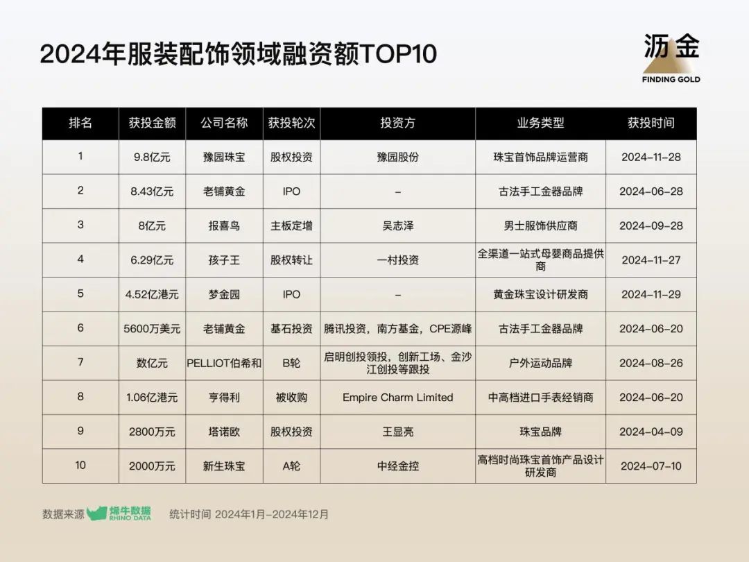 服裝配飾領(lǐng)域融資額TOP10中,近6成均為黃金、珠寶品牌,豫園珠寶、老鋪黃金融資金額均近10億元。