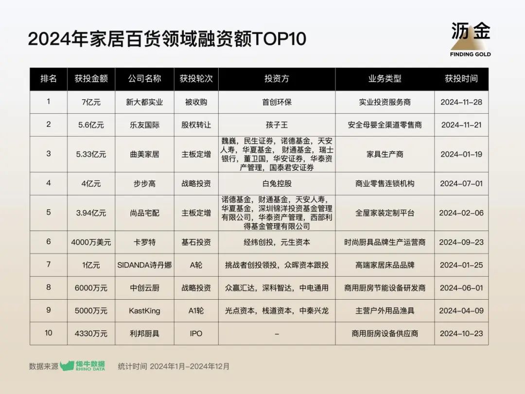 家居百貨領(lǐng)域融資額TOP10中,家居家裝、廚具設(shè)備賽道收獲多筆大額融資。