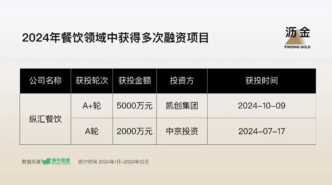餐飲領(lǐng)域獲得多次融資的企業(yè)較少,縱匯餐飲作為餐飲管理品牌共計收獲7000萬元融資,此次融資將主要用于助力縱匯餐飲旗下品牌的發(fā)展,進一步加速合作門店的擴張與升級。
