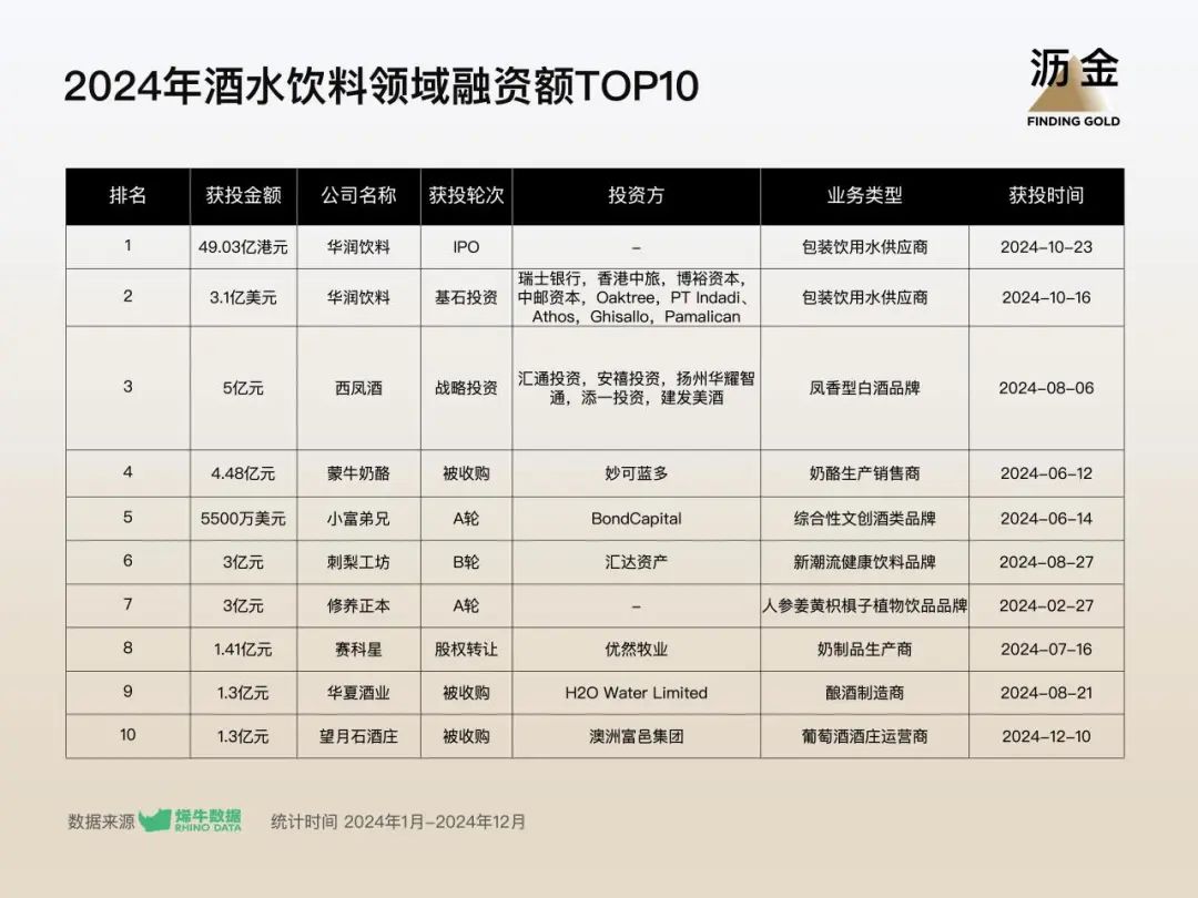 酒水飲料領(lǐng)域融資額TOP10